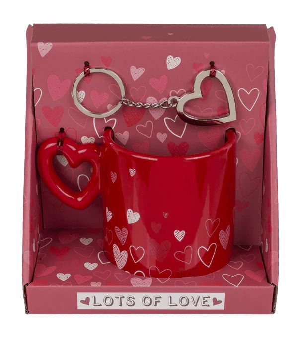 Романтичен подаръчен сет с порцеланова чаша с дръжка във форма на сърце и ключодържател сърце – нежен и стилен жест за любим човек. Вместимост - 380 мл.